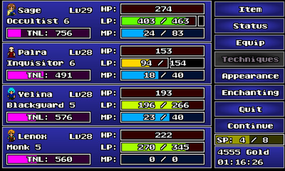 Dark is the Void is a JRPG-inspired roguelike that forgoes a story in place of pure combat, loot hoarding, min-maxing, and grinding out levels and trait points on your characters. It features 24 playable classes, each with dramatically different playstyles, special mechanics, and custom UI elements. These classes touch on the standard MMO roles of Tank, Healer, and DPS; but each class also has a high level of hybridity, blending different types of support seamlessly into each. Fast paced, real-time, menu-driven combat forms a backbone for intense tactical battles.